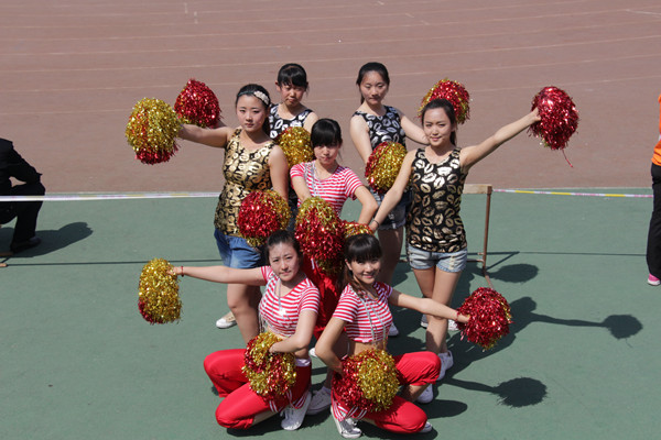为充分展示我院的风采,增强运动健儿的前进动力。4月26日上午,我院啦啦队在潍坊学院运动场我院观众台前为我院运动健儿们加油助威。