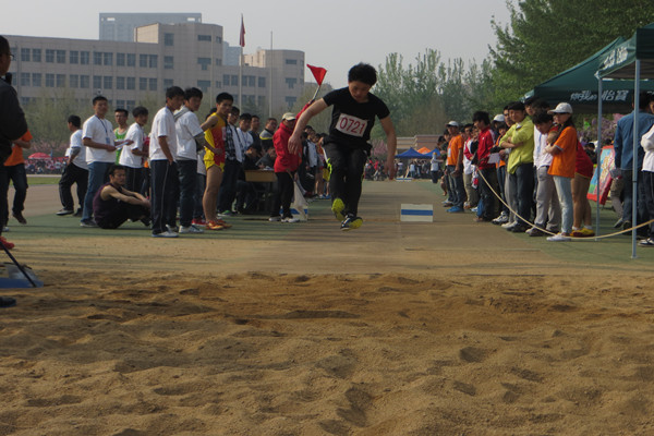 比赛前,可以看到剧树芃和李继磊同学正在积极的做着准备动作。随着裁判手举红旗的落下,李继磊如箭一般的加速助跑,飞跃腾空,近似表演的空中走步,落地的瞬间,周围爆发出观众阵阵惊叹与掌声。尽管对手很强,但是他们二人却没有因此气馁。一次一次的助跑一次一次的起跳,一次一次的腾空一次一次的落地。他们一次又一次的奔向着那片金黄,向着更远的距离发出挑战。