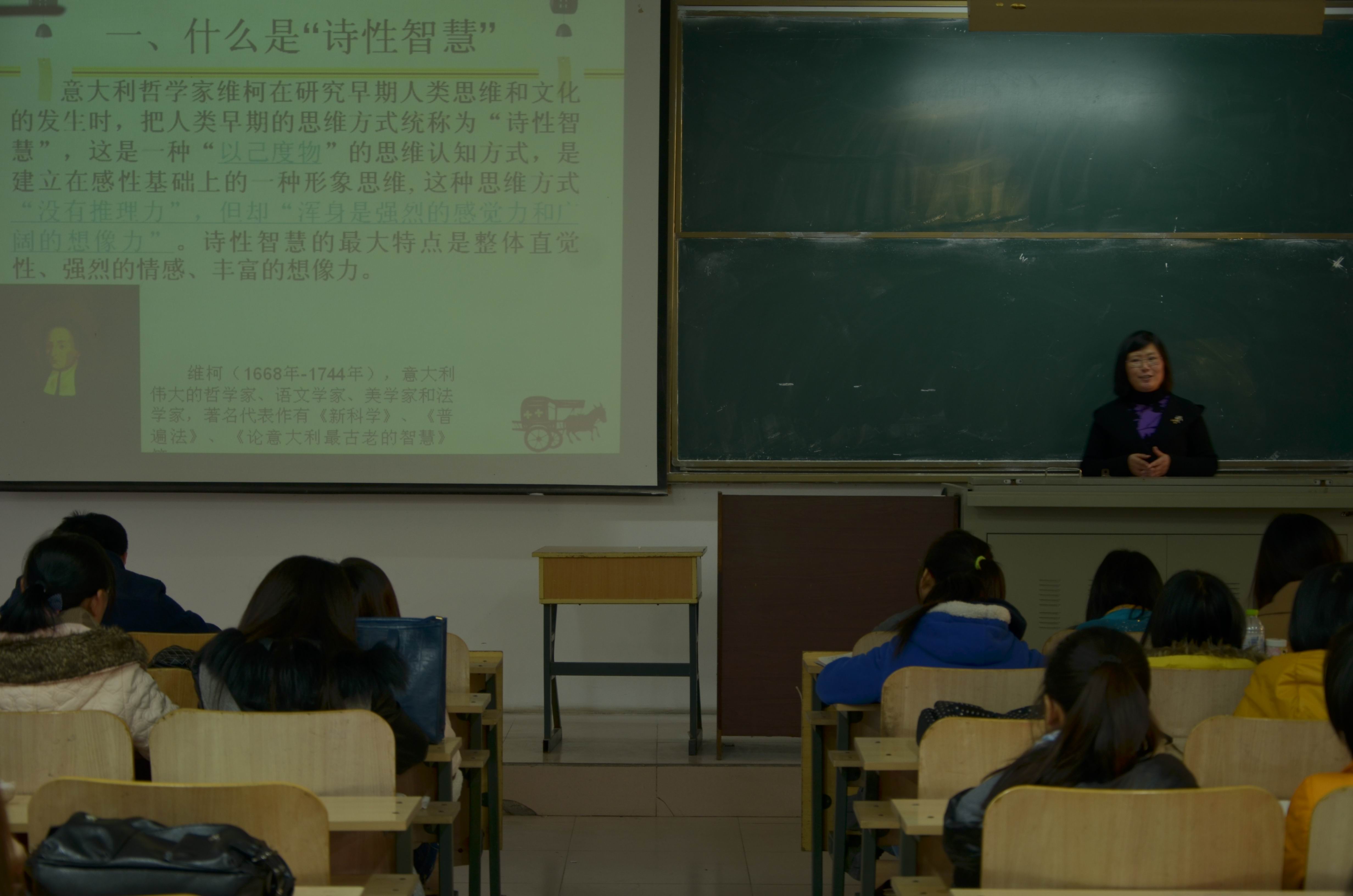 本次讲座,赵红卫老师从诗性智慧的来源、诗性智慧在中国古典文学的体现及诗性智慧对当代人生活的启示意义三方面进行了阐述。诗性智慧最早来源于意大利哲学家维柯的思想中,诗性智慧的最大特点是整体直觉性、强烈的情感、丰富的想象力。在中国古典文学中,诗性智慧主要体现在两个方面:一是“天地与我并生,而万物与我为一”的和谐思想;二是“以己度物”的思维方式,即整体直观的体悟。在介绍这两方面时,赵红卫老师着重介绍了庄子的 《齐物论》 、《周易》中与天人合一有关的内容、以及苏轼的《定风波》 。中国古典文学对这两方面的写作多采用比兴、象征、主客观交融的意象与意境的写作技巧。诗性智慧对当代人有很多启示意义,德国诗人荷尔德林《人,诗意的栖居》中说道:“人充满劳绩,但还是诗意的栖居在这片大地上。”所以,在这喧闹的社会中,我们也要找到属于我们自己诗意的生活!
