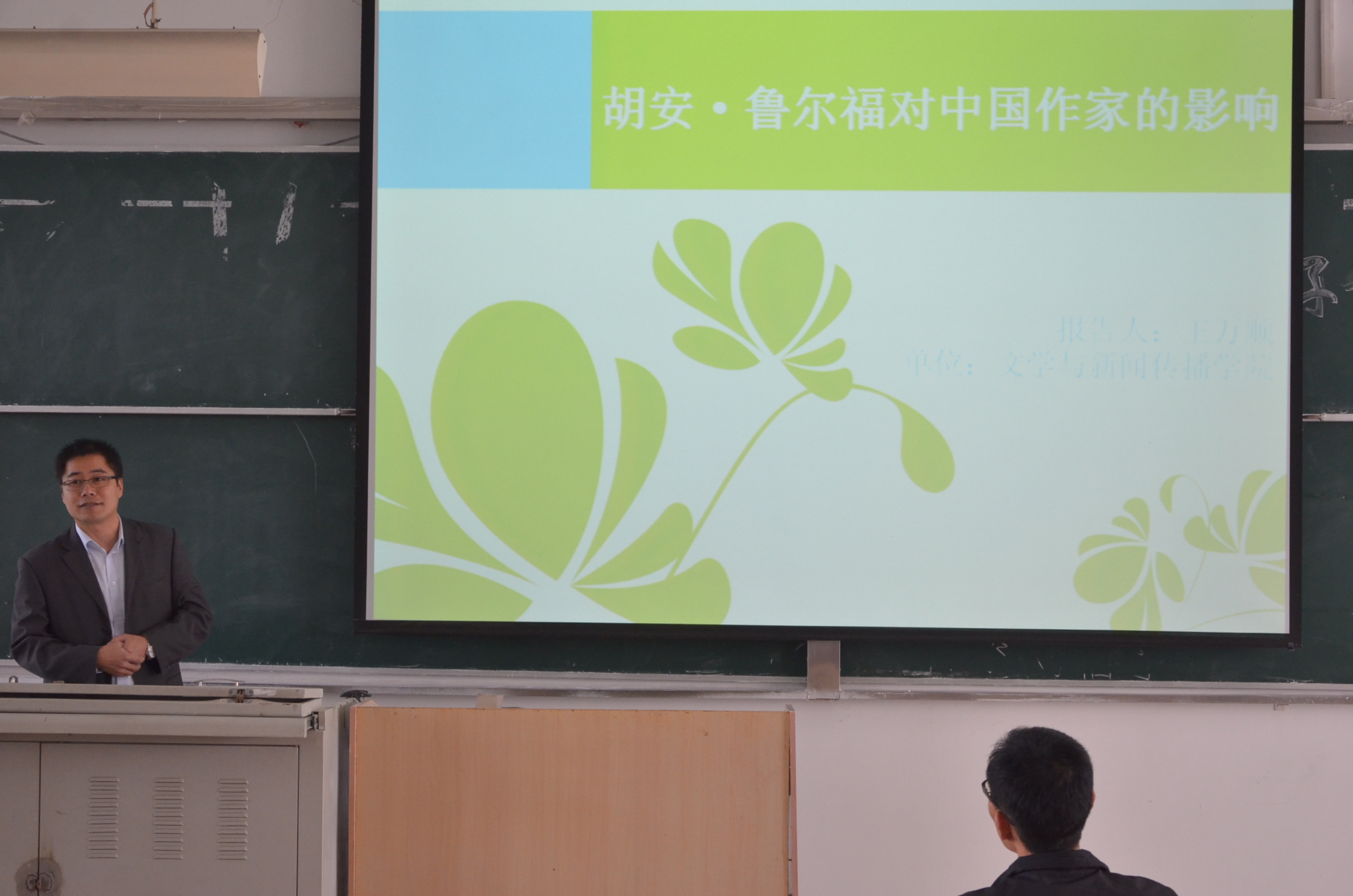 此次“博士论坛”讲座将现当代文学作为讲座主题,以“胡安·鲁尔福对中国作家的影响”作为本次讲座的内容,讲座由王恒升副院长主持开场。讲座开始,王万顺博士以广为人知的加西亚·马尔克斯为入手点,向同学们叙述了鲁尔福对马尔克斯的重要影响,并介绍了被誉为“拉美新小说先驱”的鲁尔福,还用形象的“拉美文学地图”来展现鲁尔福在拉美文学的历史地位。王万顺博士介绍到中国八十年代的“寻根派”、“先锋派”都曾受鲁尔福的影响,列举了受马尔克斯影响的陈忠实、莫言、贾平凹,受鲁尔福影响的余华、苏童、阎连科等人,并具体讲述了鲁尔福对这些中国作家的作品影响在哪。在会中,王万顺博士以鲁尔福的中篇小说《佩德尔·巴拉莫》做了详细的介绍和分析,并讲到这不到十万字的小说中具有的“多重叙述视角的运用,打破传统的时空观念,模糊的生死界限”三种艺术特点,还以中国的《聊斋志异》作出了比较。王万顺博士总结了鲁尔福的艺术魅力,以“叙事视角、时空观念、亡灵叙事”三种叙述方式分析了鲁尔福与中国当代作家的相同点和不同点,并指出相同的是“现实主义、底层关怀、民间文化底蕴”,不同的“政治隐喻、对人际关系的表现”,还列举了“独白对话,声音大师,气氛营造、‘对年以后’、叙事模式”等独特的艺术技巧。