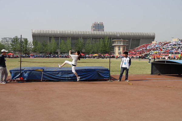 身轻如燕,飞跃蓝天。4月28日下午两点半,学生女子组跳高预赛在潍坊学院运动场正式举行。我院2011级播音与主持专业的高文倩代表我院参与本次跳高比赛。