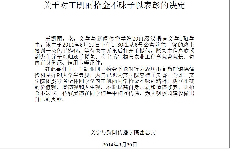 为了加强学生的思想道德建设,树立正确的价值观,发掘优秀先进学生的典型,树立榜样。6月5日,我院团总支做出了“关于对王凯丽拾金不昧予以表彰的决定”,以此来表彰我院2011级汉语言文学1班王凯丽同学。