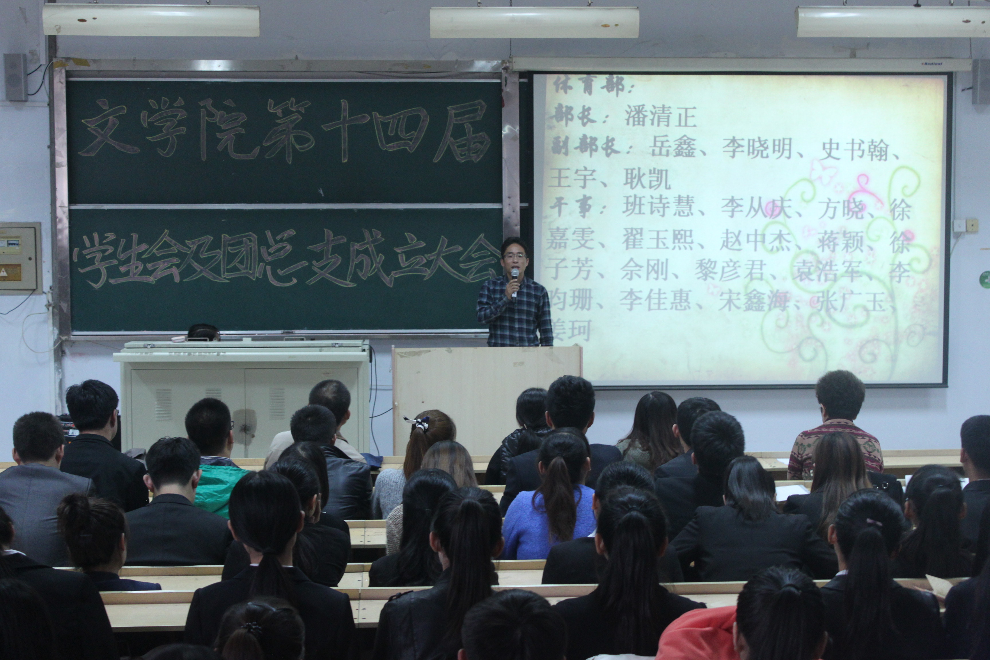 10月24日下午,文学与新闻传播学院第十四届学生会及团总支成立大会在6201教室举行。出席本次成立大会的领导有文学与新闻传播学院党总支书记郭顺敏,文学与新闻传播学院团总支副书记、辅导员办公室副主任郭荣波,辅导员辛桂京老师等。