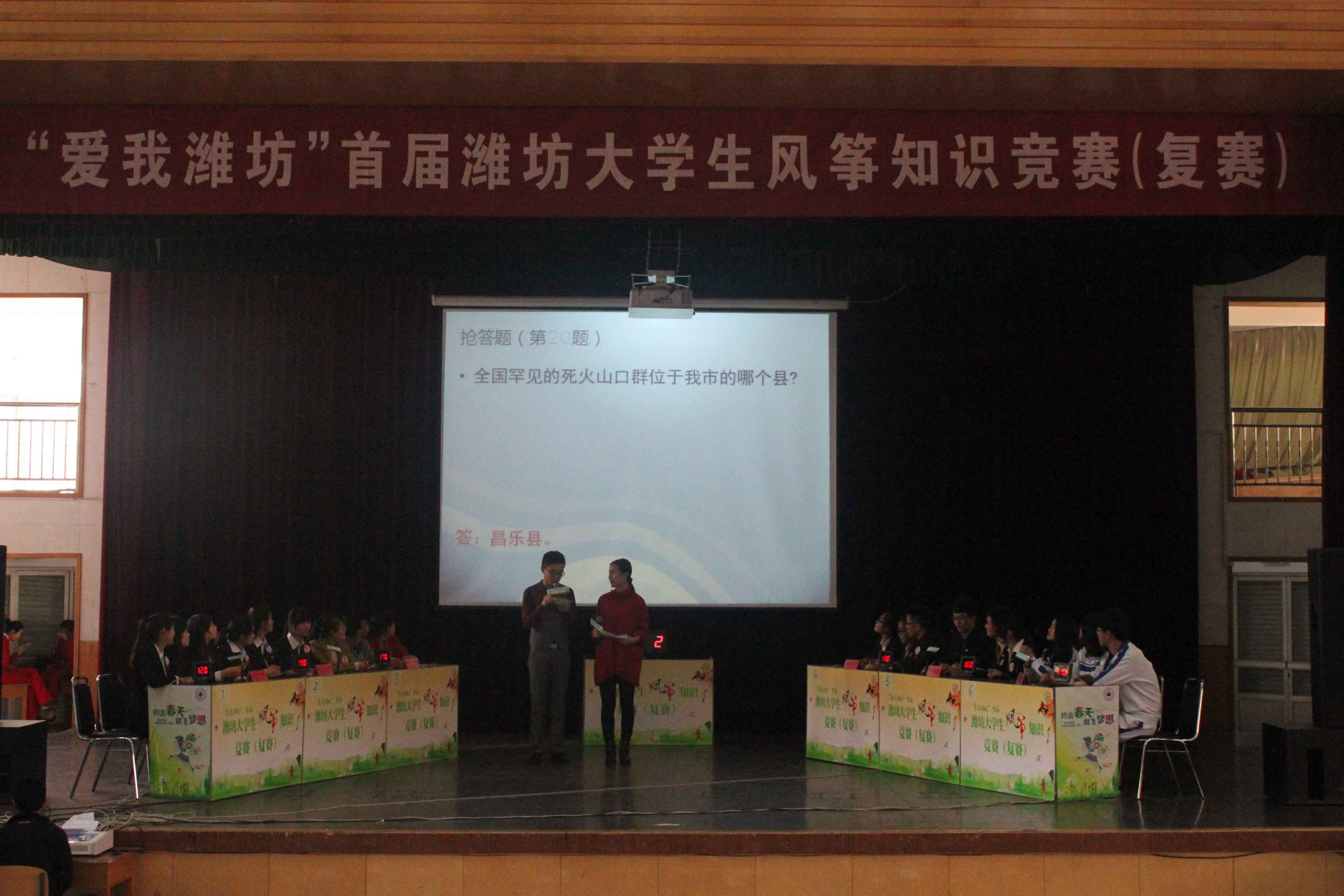4月20日下午,“爱我潍坊”首届潍坊大学生风筝知识竞赛在闻韶楼音乐排练厅举行,参加比赛的队伍有山东经贸职业学院、潍坊职业学院、潍坊护理职业学院、潍坊学院等十二所院校。出席本次知识竞赛的有各校的领导以及潍坊学院的部分学生代表。