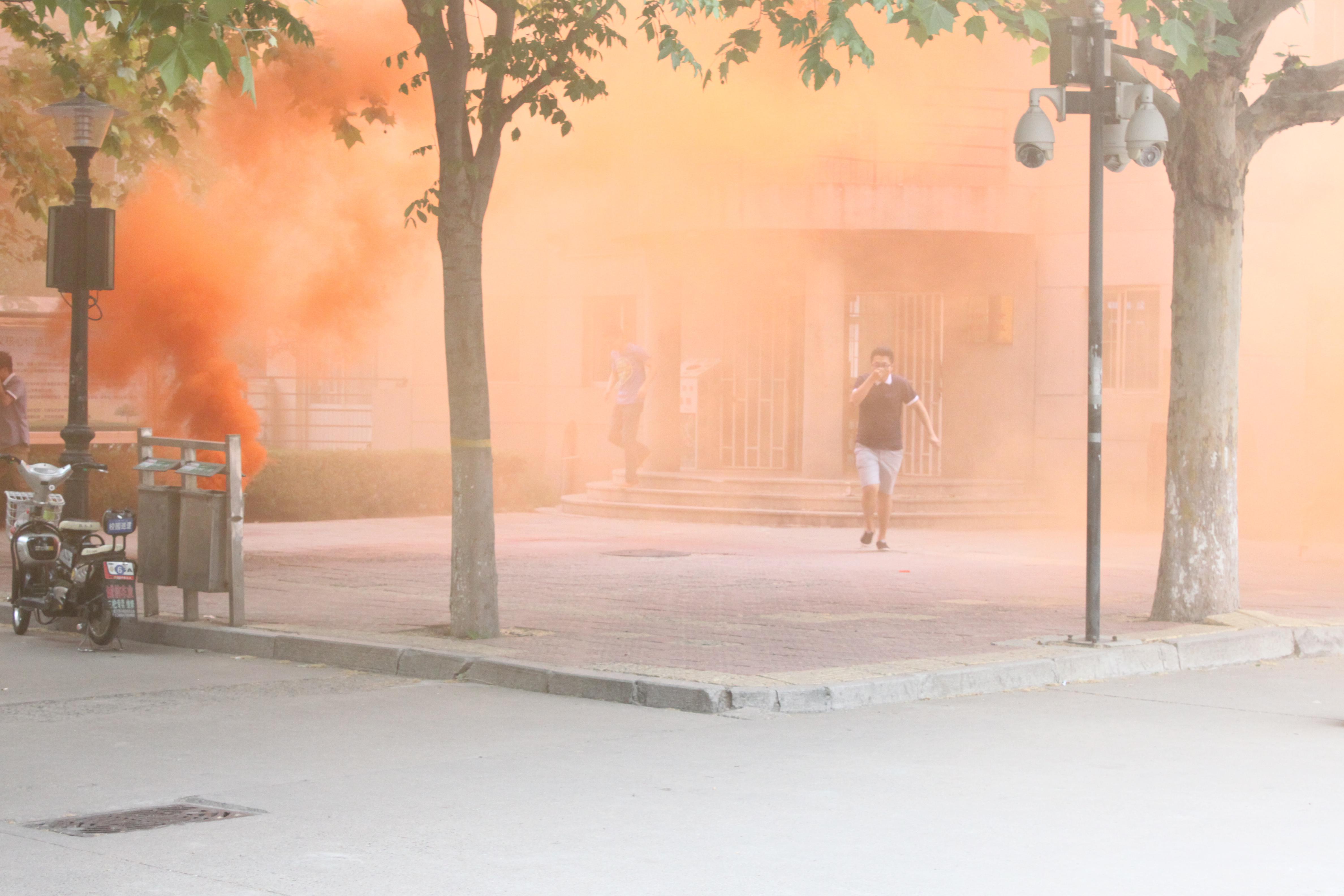 首先,在消防演练开始之前,同学们都在公寓里准备,自己自由活动,接下来,由工作人员在公寓门口放上烟雾弹,将烟雾弹点燃,随着警报声的响起,相关人员将公寓的出口全部打开,在公寓负责人的指导下,学生们手捂口鼻,弯着腰从公寓的不同出口分散跑出来,在逃脱过程中学生们都是有秩序的呈一字纵队跑出来的,在浓浓烟雾中仅出现几个学生的身影,而大部分学生都在烟雾变浓之前逃脱出来,全部演练过程用时比较短,工作人员也在演练过程中进行帮助逃脱。逃脱的学生站在公寓外等待演习的结束。最后,记者采访了一名参与其中的学生,该名学生说:“在大学里有机会参加一次这样的活动很好,可以让自己面对火灾时知道如何逃生,以后类似的活动可以多多参与。”