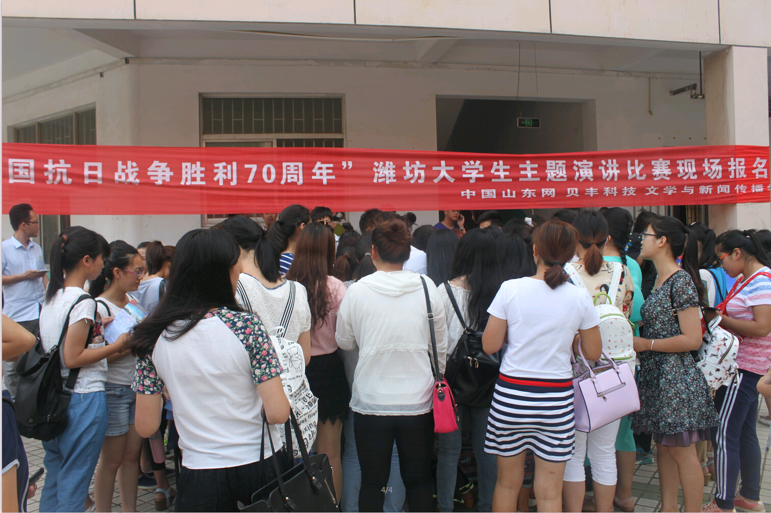 为响应市委宣传部“纪念中国抗日战争胜利70周年”潍坊大学生演讲比赛活动安排,隆重纪念中国人民抗日战争暨世界反法西斯战争胜利70周年,引导大学生们牢记历史、不忘过去,深刻汲取中国人民抗日战争胜利的历史经验,深刻牢记以爱国主义为核心的伟大民族精神是中国人民团结奋进的精神动力,珍爱和平、开创未来,为实现中华民族的伟大复兴而努力奋斗,特举办此次“纪念中国抗日战争胜利70周年”潍坊大学生演讲比赛潍坊学院选拔赛。6月10日下午,本次比赛的报名活动在6号楼开展。文学与新闻传播学院协办本次比赛。