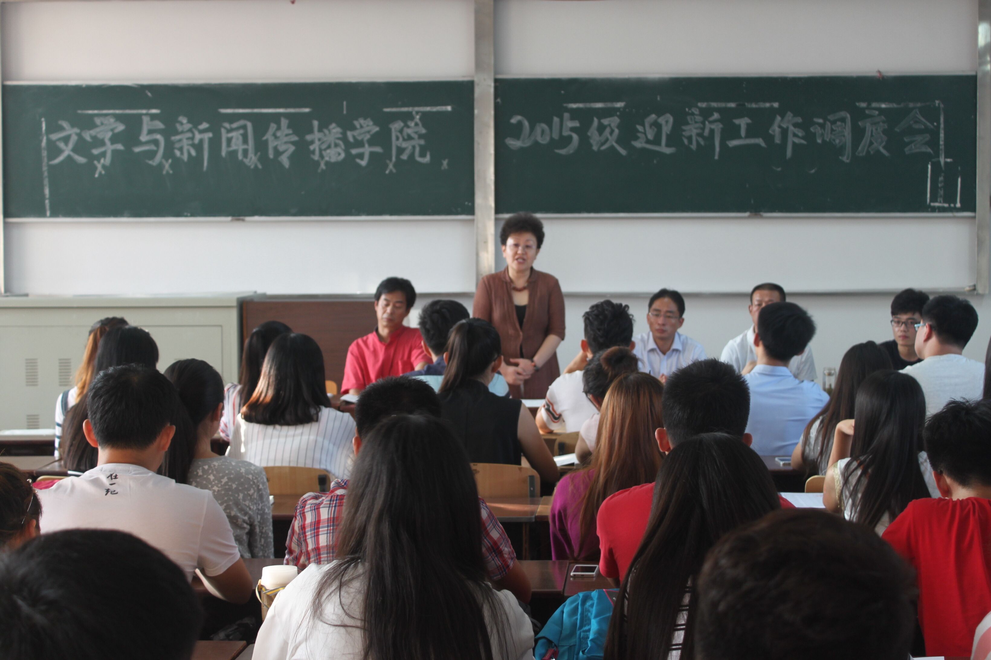 9月10日下午,文学与新闻传播学院2015级迎新工作调度会在致远楼6307教室召开。文学与新闻传播学院党总支书记郭顺敏出席会议并讲话,文学与新闻传播学院辅导员办公室副主任郭荣波主持会议,辅导员辛桂京、徐金德参加会议。文学与新闻传播学院第十四届学生会学生会主席团成员,各部部长,2013、2014级各班班长、团支书共约50人参加会议。