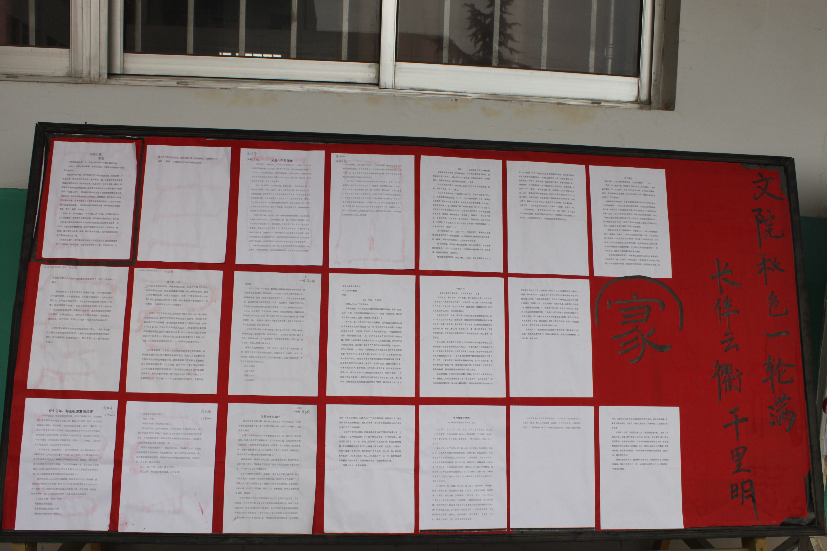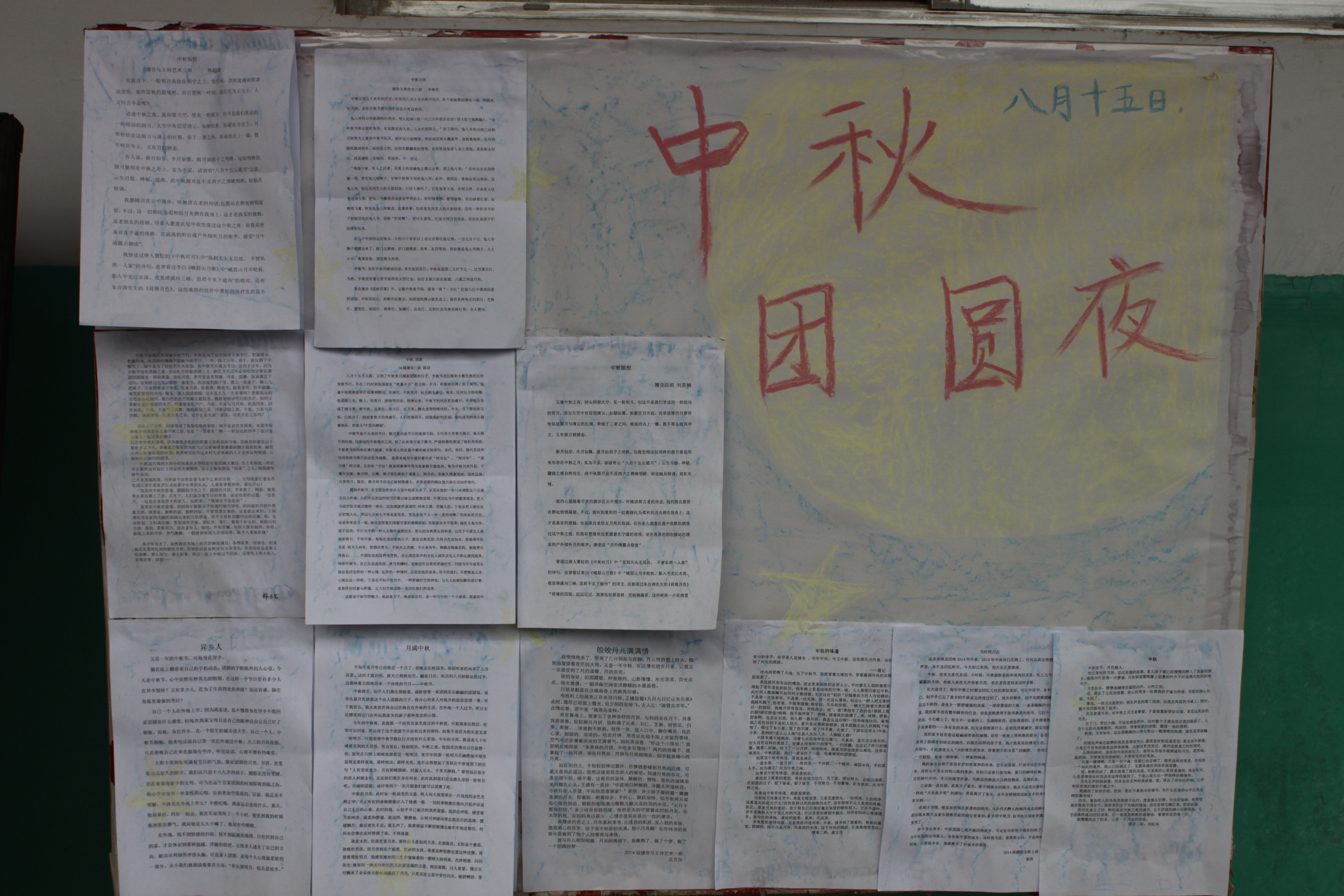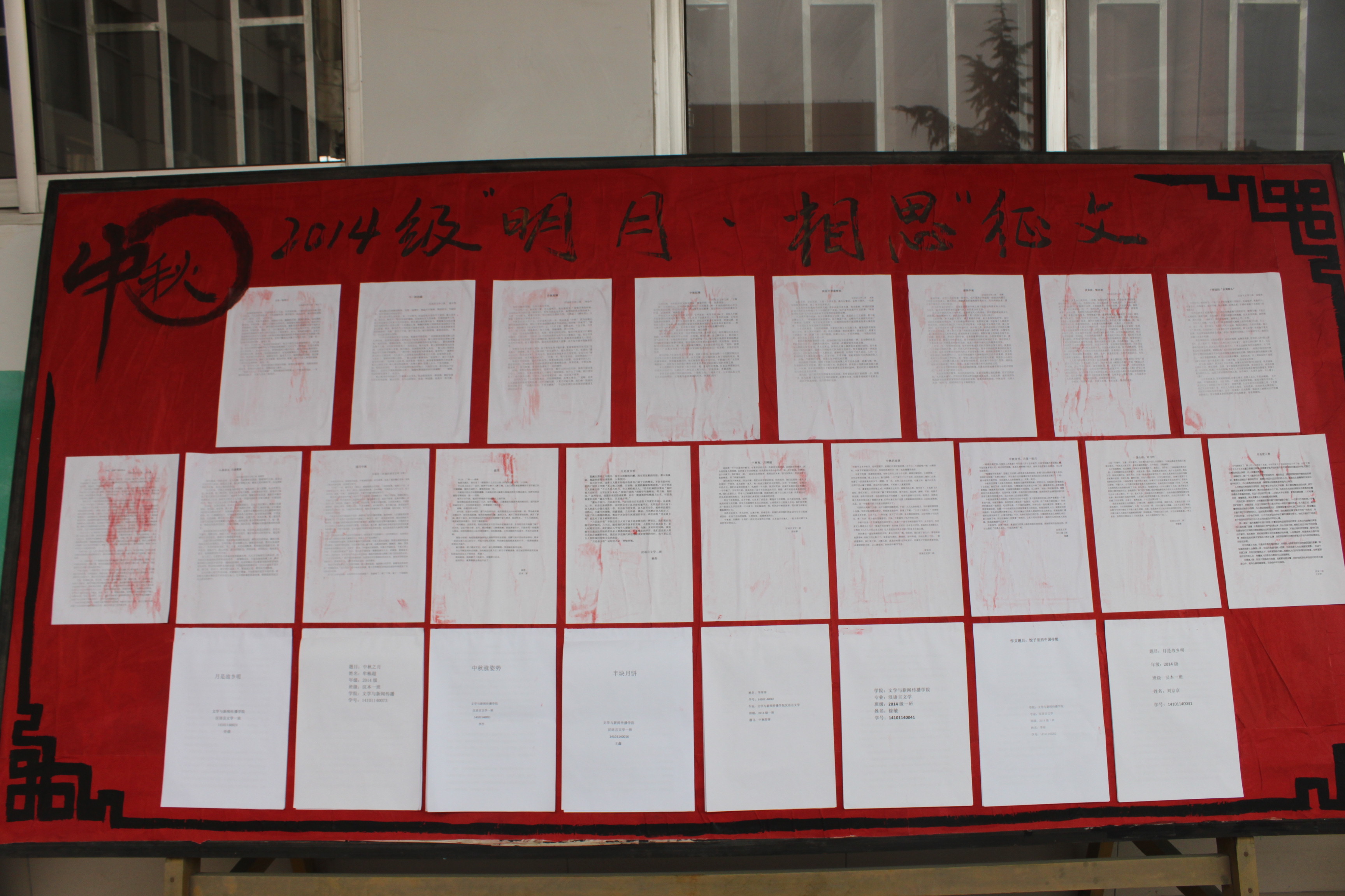 据悉,在文学院辅导员办公室副主任郭荣波老师和2014级辅导员老师辛桂京老师的倡议下,每个班级都有许多同学撰写了中秋征文,其中仅汉语言文学专业的同学就上交了四十余篇文章。同学们上交的征文经过汇总、筛选后,选出了48篇有代表性的优秀征文张贴在了在6306教室门口的宣传板上,供大家学习与欣赏。同学们在文章中表达了自己对家人的思念与深深的感情和在校无法与亲人相聚的惋惜,而许多不能回家的同学在学校和朋友一起过中秋,在异乡也感受到浓浓的家的氛围。