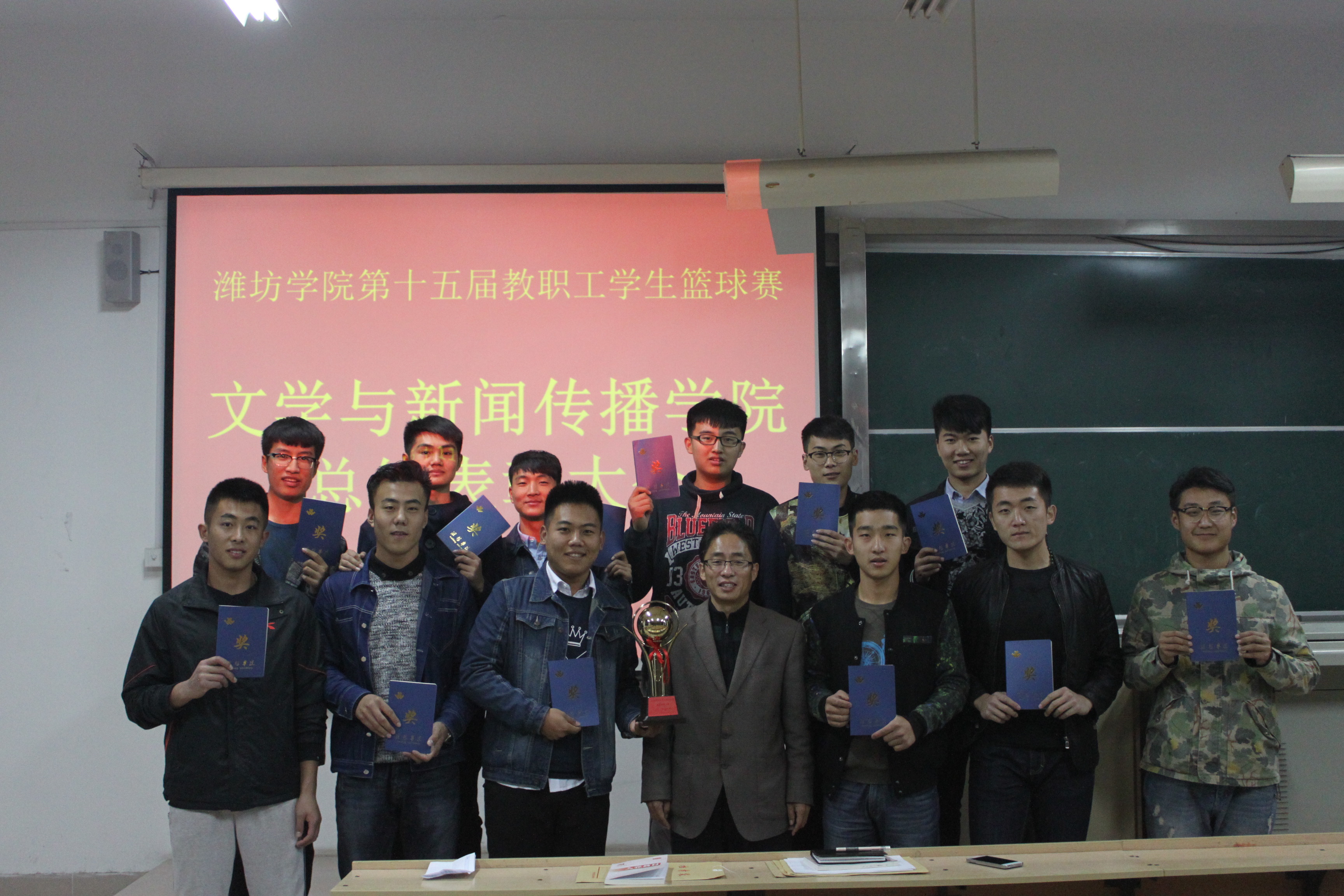 11月4日,历时17天的潍坊学院第十五届教职工、学生篮球赛落下帷幕。文学与新闻传播学院代表队获学生组第八名,创近年来参赛最好成绩。4日下午,在学校风雨球场举行第十五届篮球赛闭幕式,副院长王清明为获奖代表队颁奖。
