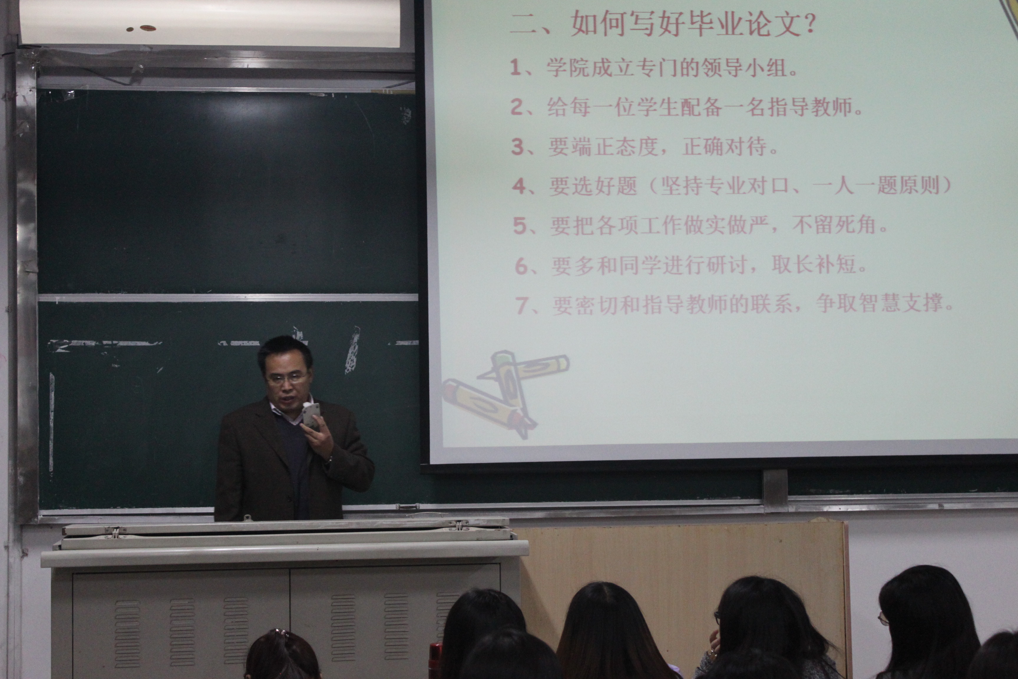 会议由文学与新闻传播学院副院长王恒升主持。会上,他从六个方面对毕业论文工作进行讲解。一是为什么要写毕业论文。他强调,毕业论文是一门必修课,是大学生运用所学基础知识和基本理论,分析、研究、解决实际问题的一次实践锻炼过程,是对大学生学习成果的一次综合性检测与总结,撰写毕业论文对于培养学生的各项能力,提高综合素质具有重要意义。二是如何写好毕业论文。他指出,学院会成立专门的领导小组,给每一位学生配备一名指导教师,为同学们提供良好的资源支持,也要求学生端正态度,正确对待,选好题目,要坚持专业对口,一人一题的原则,多和同学研讨,取长补短,要密切和指导老师的联系,争取智慧支持。三是优秀毕业论文的标准。毕业论文要有较强的创新性,避免论文重合。四是撰写毕业论文需要做的具体工作。要求同学们认真斟酌,谨慎选题和开题。五是撰写论文工作的具体时间安排。同学们要明确、合理的进行时间分配和安排。六是写作过程的具体注意事项。