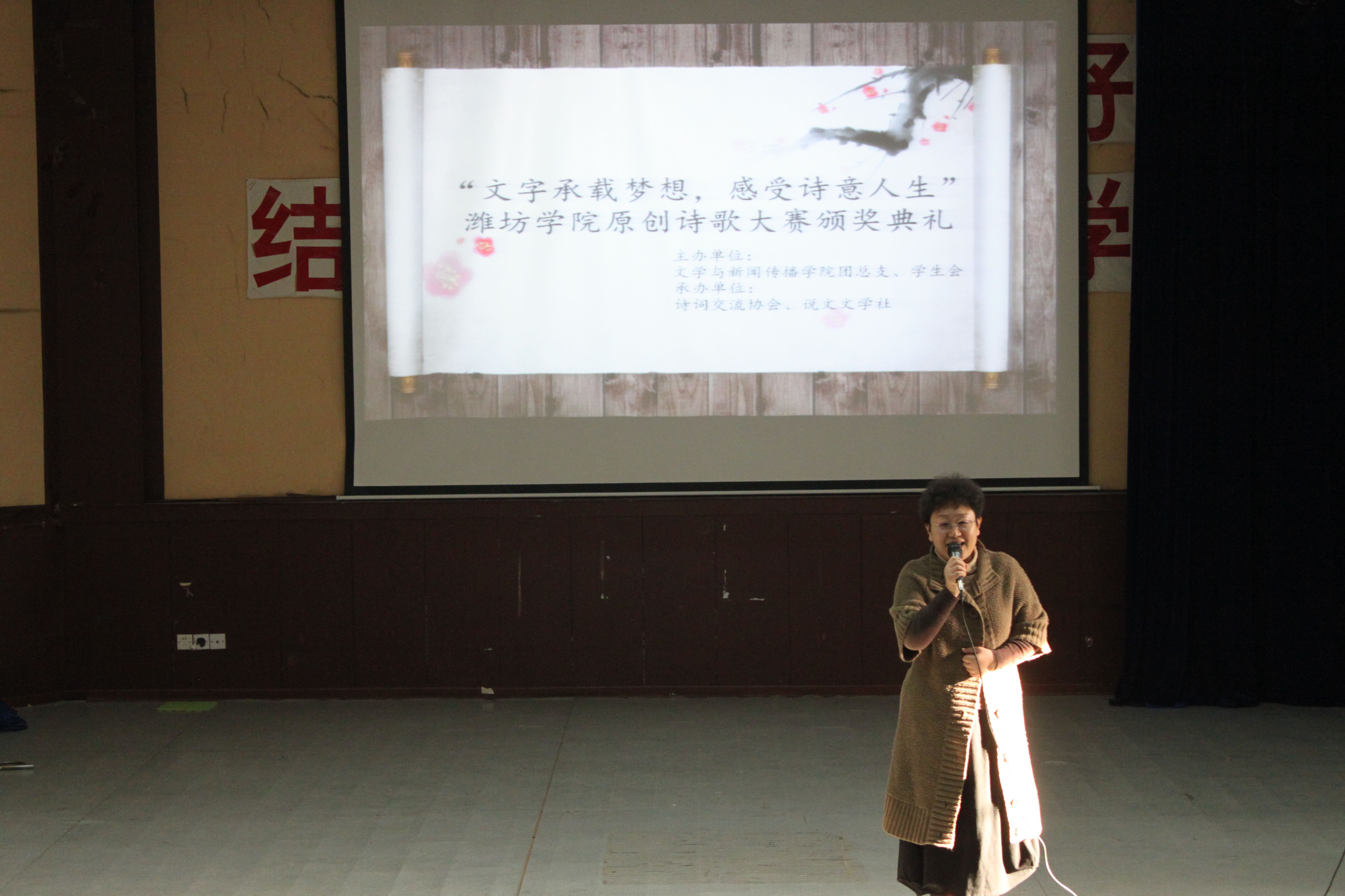 12月3日下午,“文字承载梦想,感受诗意人生”潍坊学院原创诗歌大赛颁奖典礼在天一楼7117教室隆重举行。本次颁奖典礼由文学与新闻传播学院团总支、学生会主办,诗词交流协会、说文文学社承办。文学与新闻传播学院党总支书记、中华诗词学会会员、中国李清照辛弃疾学会理事郭顺敏出席颁奖典礼并作主题讲话,文学与新闻传播学院宫存波老师现场讲解古典诗词。原创诗歌大赛获奖同学和来自各学院的诗词爱好者们参加了活动。