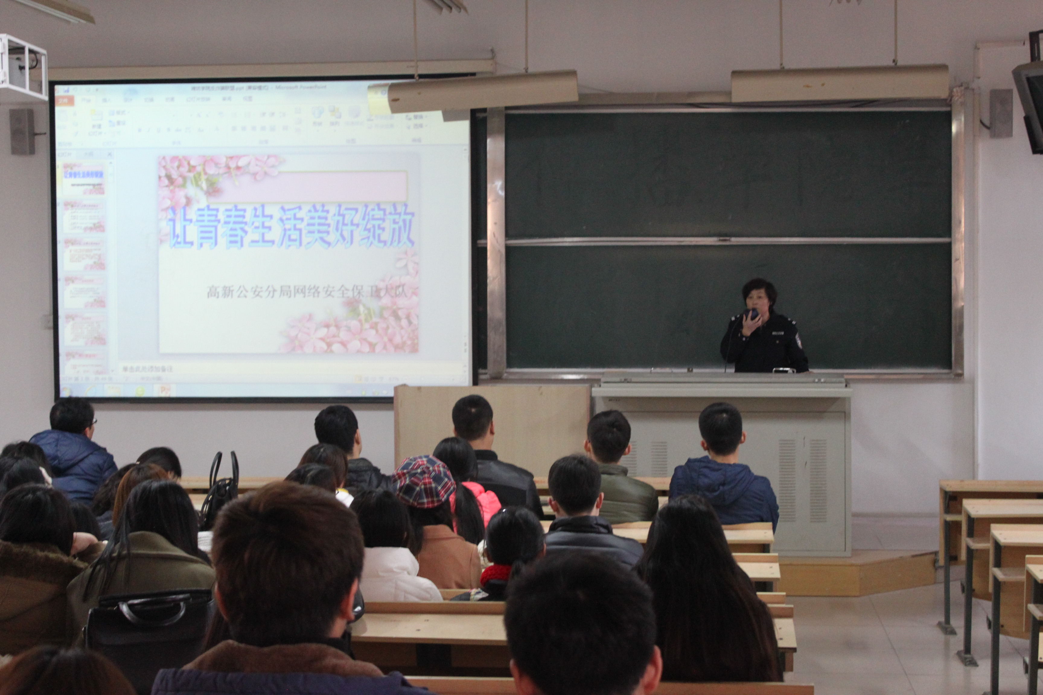 讲座上,辛苗队长首先给同学们放映了一段关于校园分期购诈骗的视频,视频中生动的案例让同学们对分期购诈骗的形式和手段有了一定的了解。随后她又向同学们介绍了电信网络诈骗,她指出,同学们在使用QQ、微信等网络交际平台时,一定要提高警觉性,注意提防信息诈骗、冒充同学行骗等。