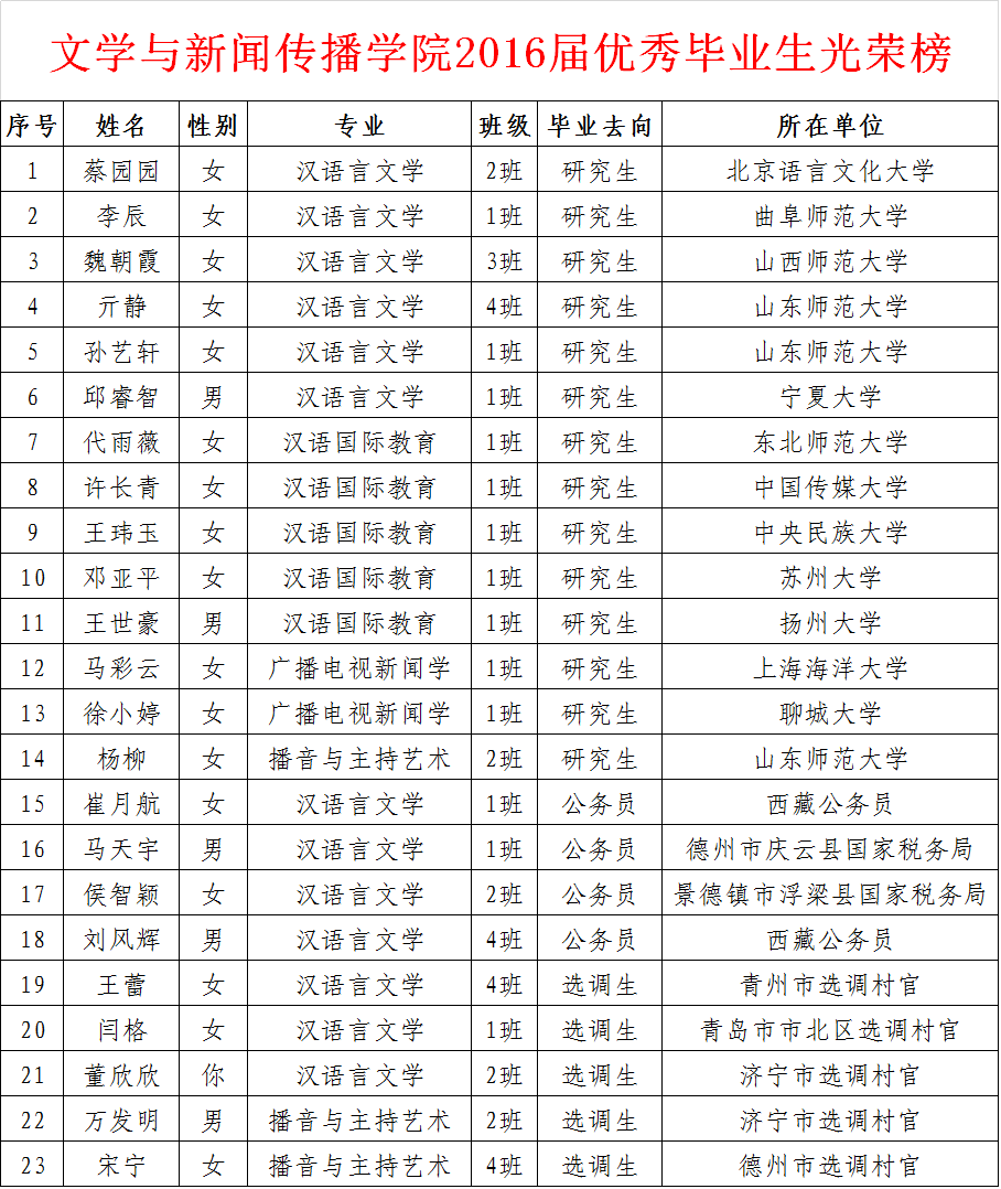 文学与新闻传播学院2016届优秀毕业生光荣榜