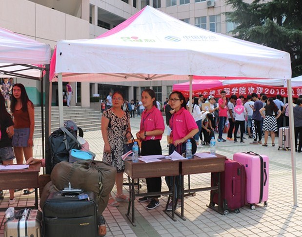 秋日的蒙蒙细雨赶走了往日的炎热,没有春雨的淅沥,亦没有夏雨的磅礴,夹杂着丝丝凉风的秋雨时有时无,带来了期盼已久的清凉。9月10日早六点,文学院新闻传播学院的志愿者们就陆陆续续的开始了一天的工作,从搭棚子到接新生,一个个忙碌的身影穿梭在人海中。