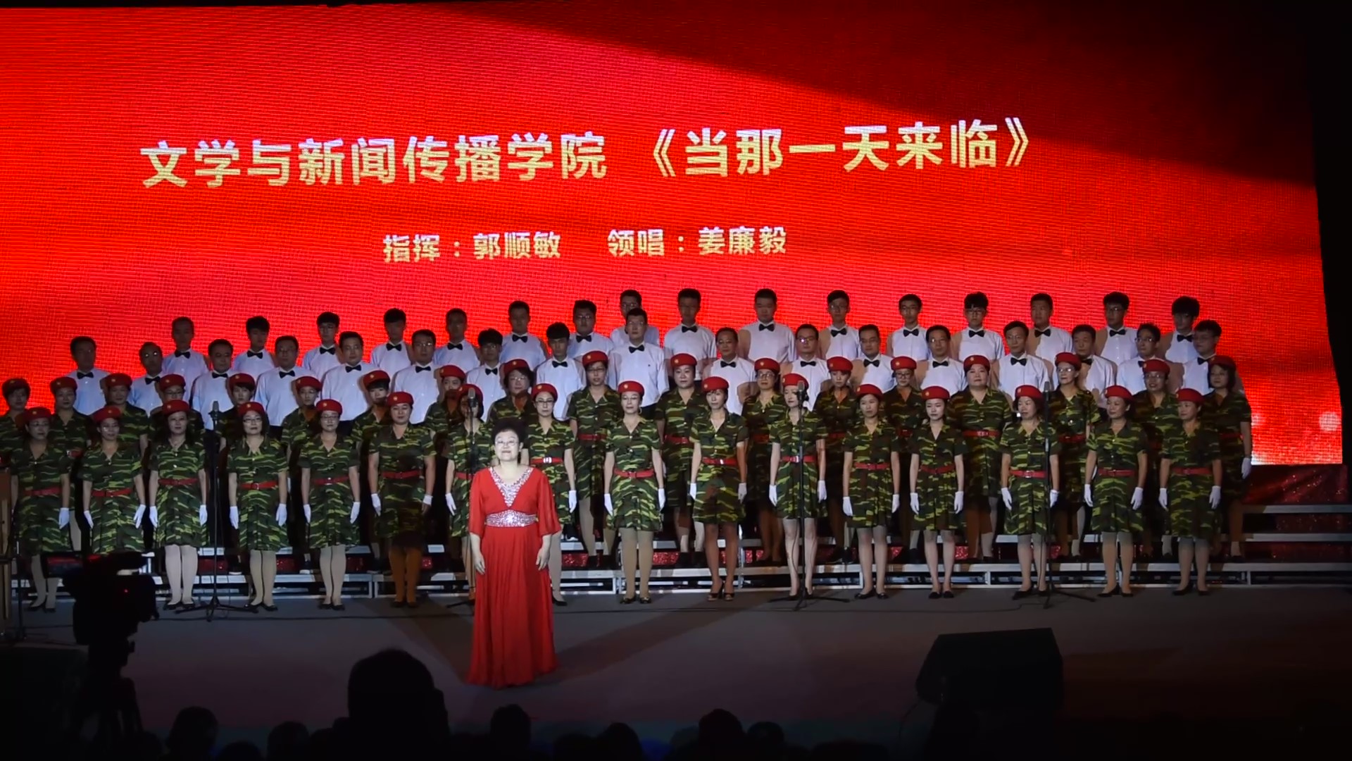 文学与新闻传播学院参赛曲目为《当那一天来临》,此歌曲为解放军总政治部2005年开展的《战斗精神队列歌曲》征集评选活动中的最佳作品之一。本次表演由文学与新闻传播学院党总支书记郭顺敏老师担任指挥,党总支副书记姜廉毅老师担任领唱,全体文学院教职工参加。舞台上,男老师们身着笔挺的西装,神采飞扬;女老师们身着女兵军装,英姿飒爽。“放心吧祖国,放心吧亲人,为了胜利我要勇敢前进!”文学院的这首歌曲唱出了我们的军人为了祖国的安宁、人民的幸福,不畏战争,勇于奉献的精神气概。