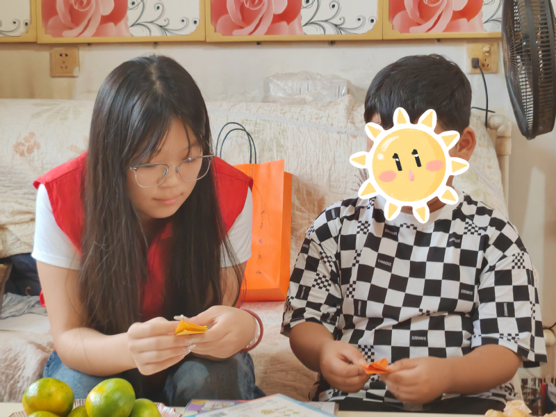 得知孩子擅长折纸,能折出多种动物,队员化身“学生”向他请教。折袋鼠的过程中欢声笑语不断,大家在互动中倾听孩子心声,用持续陪伴驱散孤单,用真诚鼓励点亮希望,让孩子深切感受社会温暖。