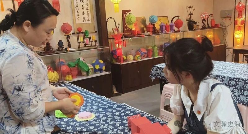 无骨花灯的奥秘,正藏在这些细节里。无需骨架,全凭纸片拼贴,借精妙力学相互支撑;灯面灵动,靠绣花针笔真功夫,每平方厘米扎入百针,针针沉淀时光与耐心。点燃灯盏,光透过细密针口均匀流转,光影间浑然天成,刹那间尽显“柔软藏坚韧、简约透精巧”的独特魅力,让队员们屏息凝神,直观感受非遗技艺的极致精湛。