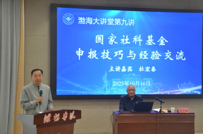 10月16日,学校特邀国家社科基金重大项目首席专家、聊城大学运河学研究院杜宏春教授作客“渤海大讲堂”,作题为“国家社科基金申报技巧与经验交流”的专题辅导。学院党委委员、副校长苗金春出席活动并为其颁发客座教授聘书,文史学院(文化与旅游学院)学术院长陈德正主持报告会,科研处负责人及全校120余名人文社科骨干教师参加活动。