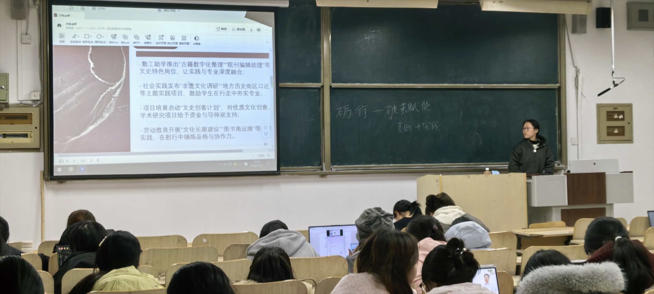 活动伊始,主持人以“资助不止于帮扶,更要以实践赋能成长”为切入点,结合文史专业特色,通过PPT演示的形式,系统解读了“勤工岗位对接+实践能力提升+成长需求满足”的育人思路,使同学们对勤工助学活动有了一定了解。