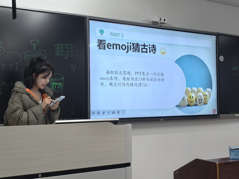 新颖emoji 和古韵古诗结合如此美妙,引得无数英雄竞折腰!最烧脑的环节莫过于“看emoji猜古诗”。 同学们根据emoji绞尽脑汁猜测答案,迟迟未中。随着“唯有牡丹真国色,花开时节动京城。”话音落地,主持人点头微笑,教室里顿时响起一片恍然大悟的“哦——”声,夹杂着答对者的兴奋和未猜出者的懊恼轻笑,空气里弥漫着破解密码般的智力快感。