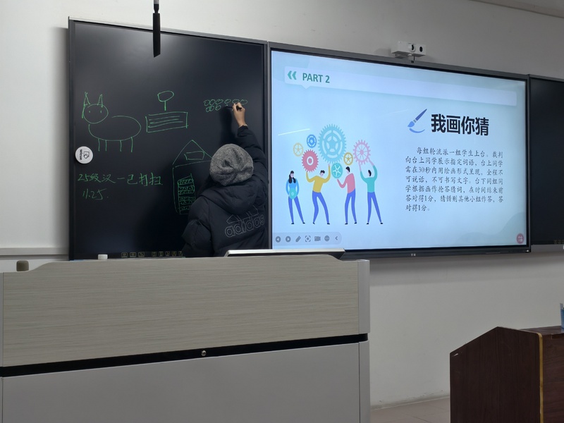 同学们通过简单的绘画,贴合所得到的提示词,台下的同学积极抢答。“拿破仑” “蜜雪冰城” “追风者的人” “归心似箭”你画我猜游戏如火如荼展开,同学们的参与热情高涨,在欢声笑语中,得以放松身心。