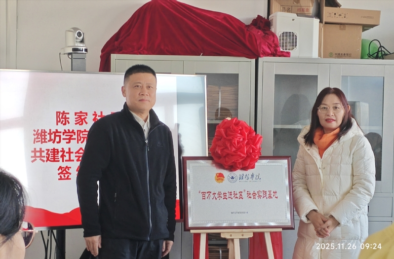 为积极响应国家号召,培养大学生的社会实践能力,11月26日,文史学院(文化与旅游学院)携手大虞街道陈家社区,开展“百万大学生进社区”社会实践供需对接会暨大学生实践基地揭牌仪式。大虞街道党工委宣传统战委员孙宝庚、陈家社区党委副书记刘金娟,学院党委书记范克文、党委副书记、副院长张芳芳、相关科室负责人及学生代表共同参加活动。