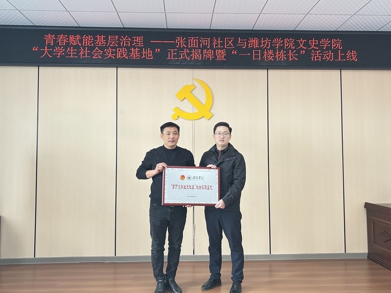 为深入学习贯彻党的二十届四中全会精神,扎实推进团中央“青年实干家计划”、团省委“百万大学生进社区”及潍院青年“实干计划”落地见效,11月28日,文史学院(文化与旅游学院)携手张面河社区举办“大学生社会实践基地”揭牌仪式。张面河社区党委书记颜君涛、文史学院学工办副主任郭泰山、团委负责人付璐及学生志愿者代表参加活动。