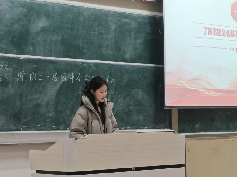 宣讲中,郑作译以清晰逻辑和通俗表达,系统介绍了二十届四中全会的召开背景、核心议程与重大意义,让同学们对全会精神的时代语境有了全面认知。她聚焦“十五五”时期发展蓝图,重点解读“六个坚持”重要原则的丰富内涵,从“坚持党的全面领导”这一“定盘星”,到“坚持人民至上”的价值坐标,再到“坚持高质量发展”的演进路径等,生动阐释了这一系统性方略对中国式现代化的根本指导意义,同时结合“十五五”时期基本目标,为同学们勾勒出国家未来发展的宏伟图景,明晰新时代青年肩负的历史使命。