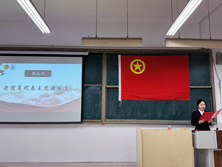 老团员代表王芝源结合“一二・九” 运动历史,强调了青年与时代的紧密联系,引用“五个模范” 要求,承诺老团员会助力新团员成长,勉励全体团员以奋斗让青春在民族复兴中焕发光彩。