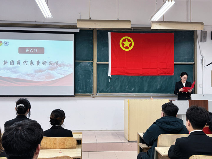 入团仪式的核心环节有序推进,付璐首先宣读了新发展团员名单。随后,郭泰山为新团员代表颁发并佩戴团徽。当闪耀的团徽被郑重别在左胸之上,40 名青年正式成为光荣的共青团员。这一时刻,不仅是身份的崭新蜕变,更意味着责任与使命已悄然扎根心底、融入血脉。全体新团员面向鲜红的团旗,右手紧握成拳,庄严举起,许下铿锵誓言。