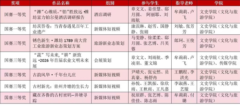 我校此次获奖作品涵盖了酒店调研、新媒体短视频和旅游新业态策划、会展策划等多个核心赛道。其中,两项荣获国家一等奖的作品,充分展现了我校学生在对接地方产业、传承文化遗产方面的深度思考与实践能力。国家一等奖(酒店调研组)比赛作品《“潍”心维质,“铂”胜致远·潍坊富力铂尔曼酒店调研报告》,聚焦区域高端酒店市场,通过细致的实地调研和专业的数据分析,为行业发展提供了极具参考价值的实践方案。国家一等奖(新媒体短视频组)比赛作品《坊茨答卷:当青春遇见百年工业遗产》以新媒体的视角,生动记录了城市工业遗产的活化与新生,将文化传播与旅游推广完美结合,获得了评委的一致好评。