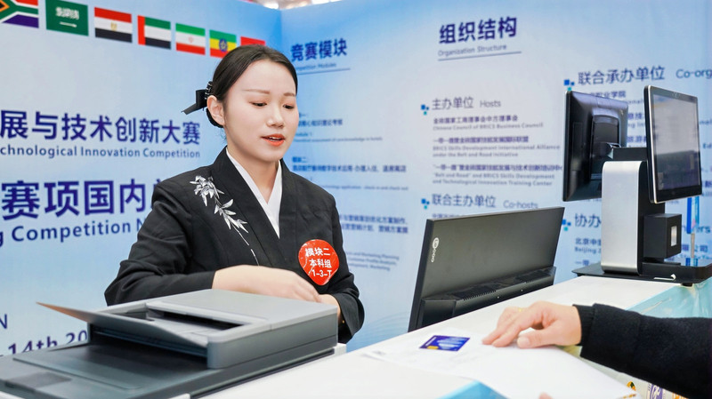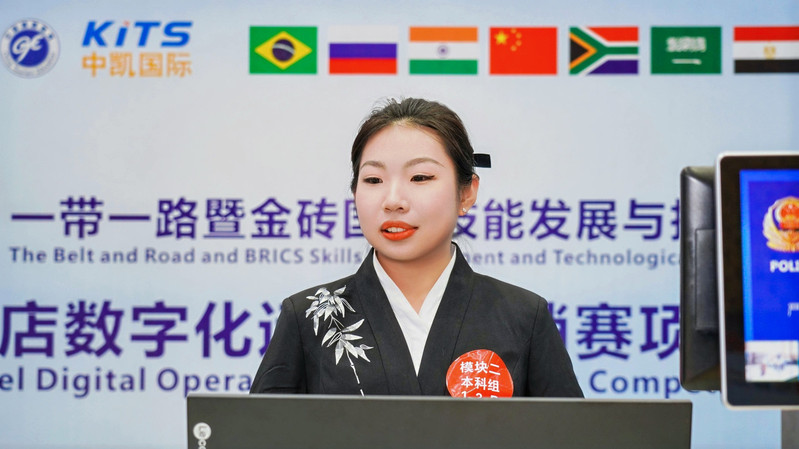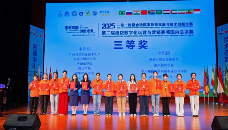 据悉,一带一路暨金砖国家技能发展与技术创新大赛是由金砖国家工商理事会中方理事会、一带一路暨金砖国家技能发展国际联盟、一带一路暨金砖国家技能发展与技术创新培训中心等单位主办的具有广泛国际影响力的赛事。本次大赛历时四天,吸引了全国125支队伍、近500名选手的积极参与,大赛以“数字化驱动、产教融合、技能强国”为主题,聚焦酒店行业数字化转型与创新运营,充分展现了职业教育与产业发展的深度融合。