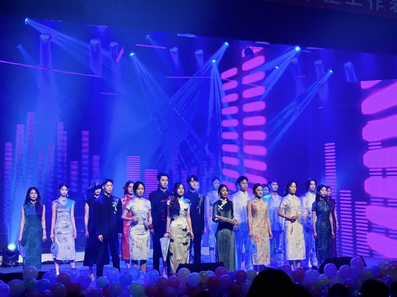 开篇模特秀《拾光步履,海纳新章》,华灯初上庭台,丝竹漫绕亭阶,模特莲步款款来,襦裙旗袍竞态,尽抒东方神采。