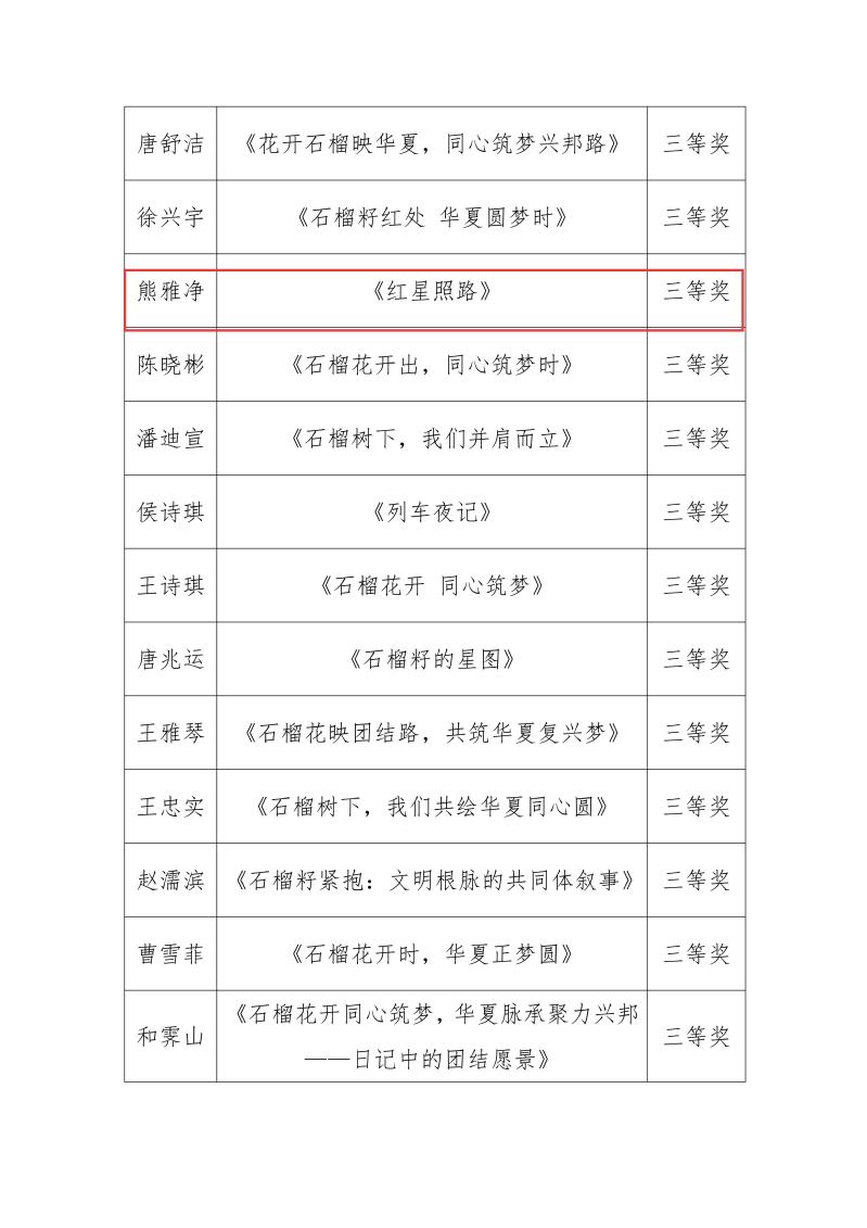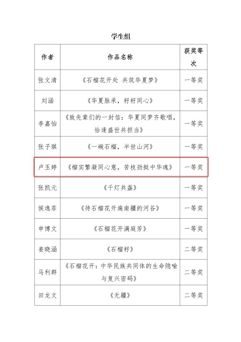 2024级汉语言文学专业卢玉婷、张少雄、熊雅净分别斩获一等奖、二等奖、三等奖。三位同学以青年视角观照时代,秉持“像石榴籽一样紧紧抱在一起”的信念,立足大学生自身使命,深入阐释新时代青年在中华民族共同体建设中的责任担当,生动展现了我院学子昂扬向上、奋发有为的精神风貌。