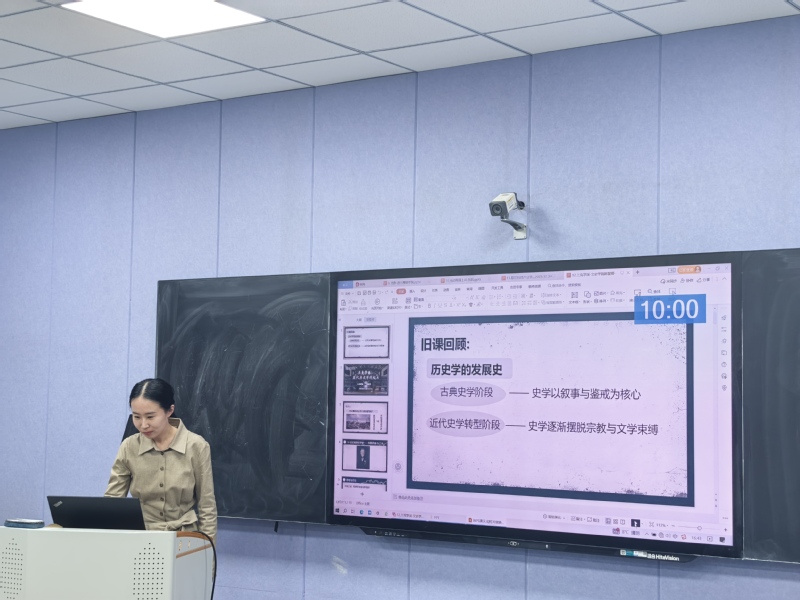 本次展示会采用现场讲课形式,要求新入职教师结合自身授课课程,完成10分钟教学展示。评审专家围绕教学内容、教学组织、语言教态、教学特色四大核心维度综合考评,现场公布评比结果。展示过程中,韩智卿紧扣授课主题,精准梳理兰克学派的核心要义与史学影响,将专业理论与教学逻辑深度融合。课堂设计条理清晰、重点突出,教学语言严谨生动、教态沉稳大方,既展现了对史学专业知识的透彻理解,又凸显了贴合学情的教学巧思,鲜明的教学特色与高效的课堂呈现,赢得了评委专家的一致认可与高度好评。