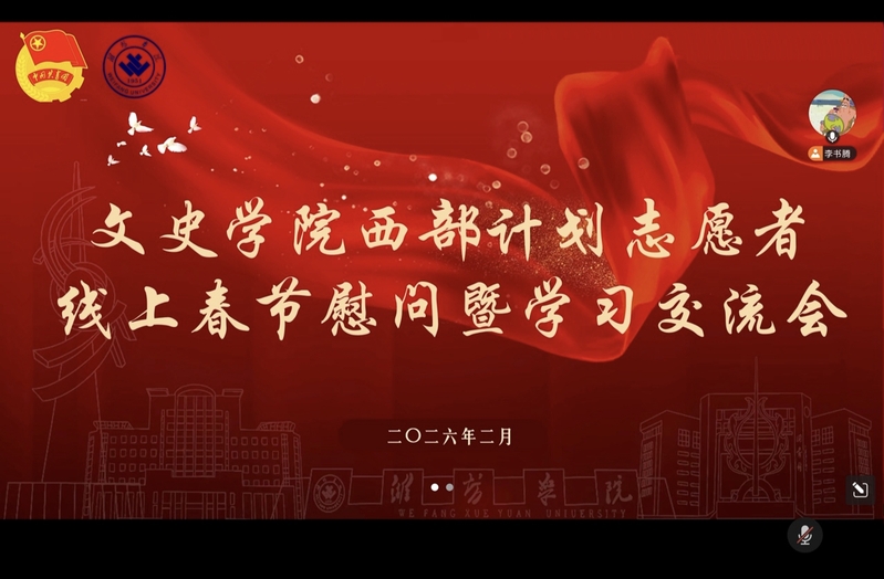 此次线上慰问交流会,是文史学院强化西部计划志愿者关怀保障、深化青年思想政治引领的重要举措。活动切实为远在西部服务的志愿者传递了温暖关怀与精神支撑,进一步凝聚了志愿力量、坚定了奉献信念;同时以优秀志愿者为鲜活榜样,充分发挥了朋辈引领作用,有效激发了文史学子投身基层、服务社会的责任感与使命感,为推动西部计划工作走深走实、培育担当民族复兴大任的时代新人注入了强劲动力。