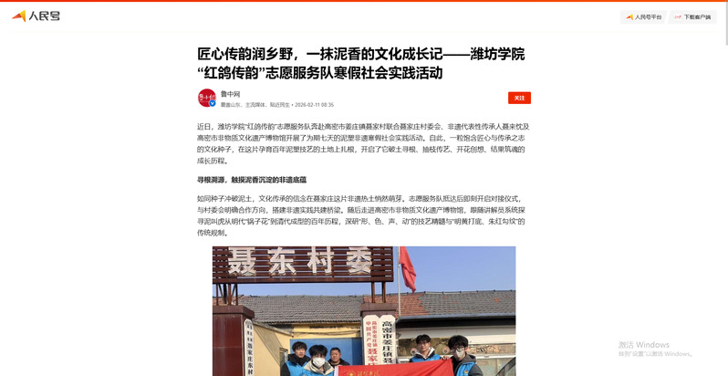 潍坊学院“红鸽传韵”志愿服务队赴高密市聂家村开展泥塑非遗寒假社会实践,凭借扎实的实践成果与创新的传承模式,获人民日报专题报道,展现了青年学子守护非遗、助力乡村振兴的青春担当。