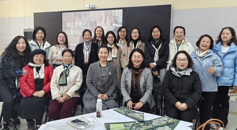 丝巾搭配美学环节则聚焦职场穿搭需求,讲师从肤色适配、穿搭呼应、场景匹配等维度,讲解丝巾色彩选择技巧,现场示范职场简约结、法式优雅结、方巾点缀法等经典系法,并为大家提供一对一指导。女教师们积极动手实践,相互交流心得,在实操中快速掌握丝巾搭配诀窍,解锁职场优雅新造型。活动现场氛围温馨热烈,互动频频。活动最后,学院为每位参与女教师送上精美定制小丝巾,让大家将所学技巧即时运用,在收获知识的同时,感受满满的节日温暖与惊喜。