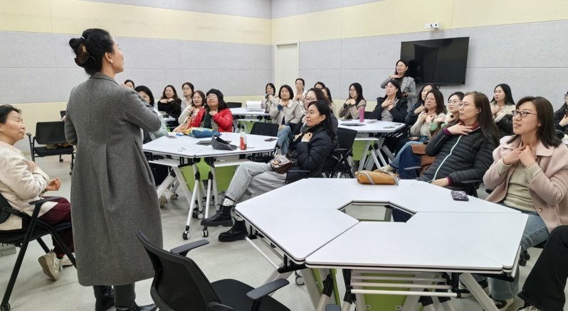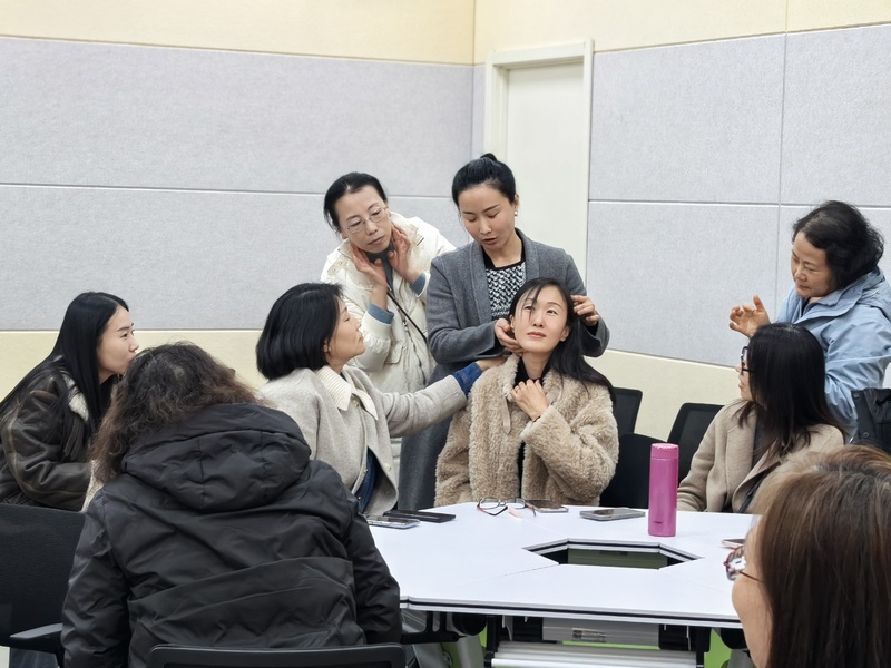 本次活动历时90 分钟,紧扣女教师工作生活实际需求,精心设置面部瑜伽护肤、丝巾搭配美学两大核心环节,特邀 2 名专业讲师现场授课指导,让大家在沉浸式体验中收获实用技巧。在面部瑜伽护肤课堂上,讲师结合女教师长期伏案工作的职业特点,细致讲解面部瑜伽的原理、功效及日常护肤常见误区,重点示范提拉紧致、改善水肿、舒缓肩颈等专业放松手法,带领全体女教师同步实操练习,并针对大家实操中的问题现场答疑解惑。课程最后,讲师还分享了简单易坚持的居家护肤流程,让科学护肤理念融入日常。