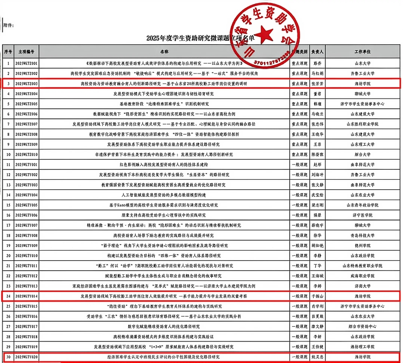 近日,山东省学生资助学会公布2025年度学生资助研究微课题立项结果,文史学院党委副书记、副院长张芳芳教授主持的《高校资助与劳动教育融合育人的创新路径研究—基于山东省20所高校勤工助学岗位设置的调研》成功获批省级重点课题。同时,我校另有2项课题获批省级一般课题,全校共3项课题入选。
