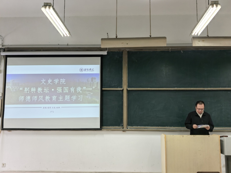 为深入落实学校“严教勤学质润校园”教学质量文化建设月工作部署,切实加强师德师风建设,引导全体教师坚守为党育人、为国育才初心使命,4月23日,文史学院组织开展“躬耕教坛 强国有我”师德师风教育主题学习活动。副院长卢飞主持学习并领学,全体教师参加活动。
