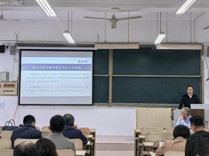 活动中,卢飞带领全体教师逐条学习《新时代高校教师职业行为十项准则》,围绕坚定政治方向、自觉爱国守法、传播优秀文化、潜心教书育人、关心爱护学生、坚持言行雅正、遵守学术规范、秉持公平诚信、坚守廉洁自律、积极奉献社会等十项核心要求进行系统解读,结合高校教育教学实际,明确师德底线、规范职业行为,引导教师将“严教提质”理念内化于心、外化于行。