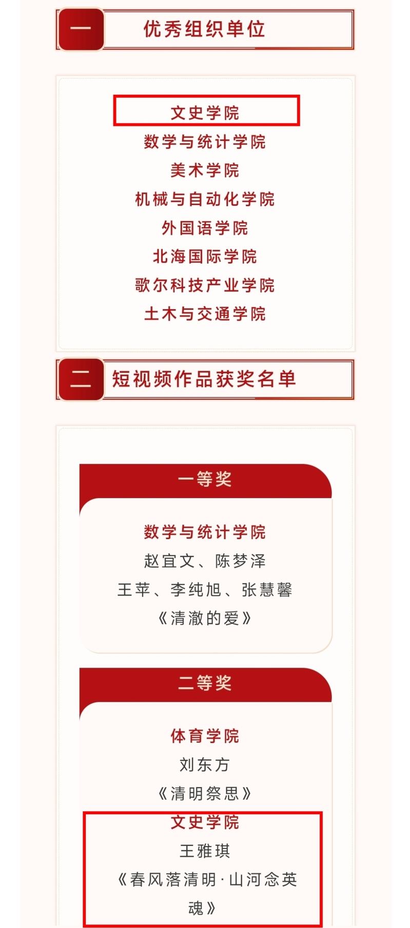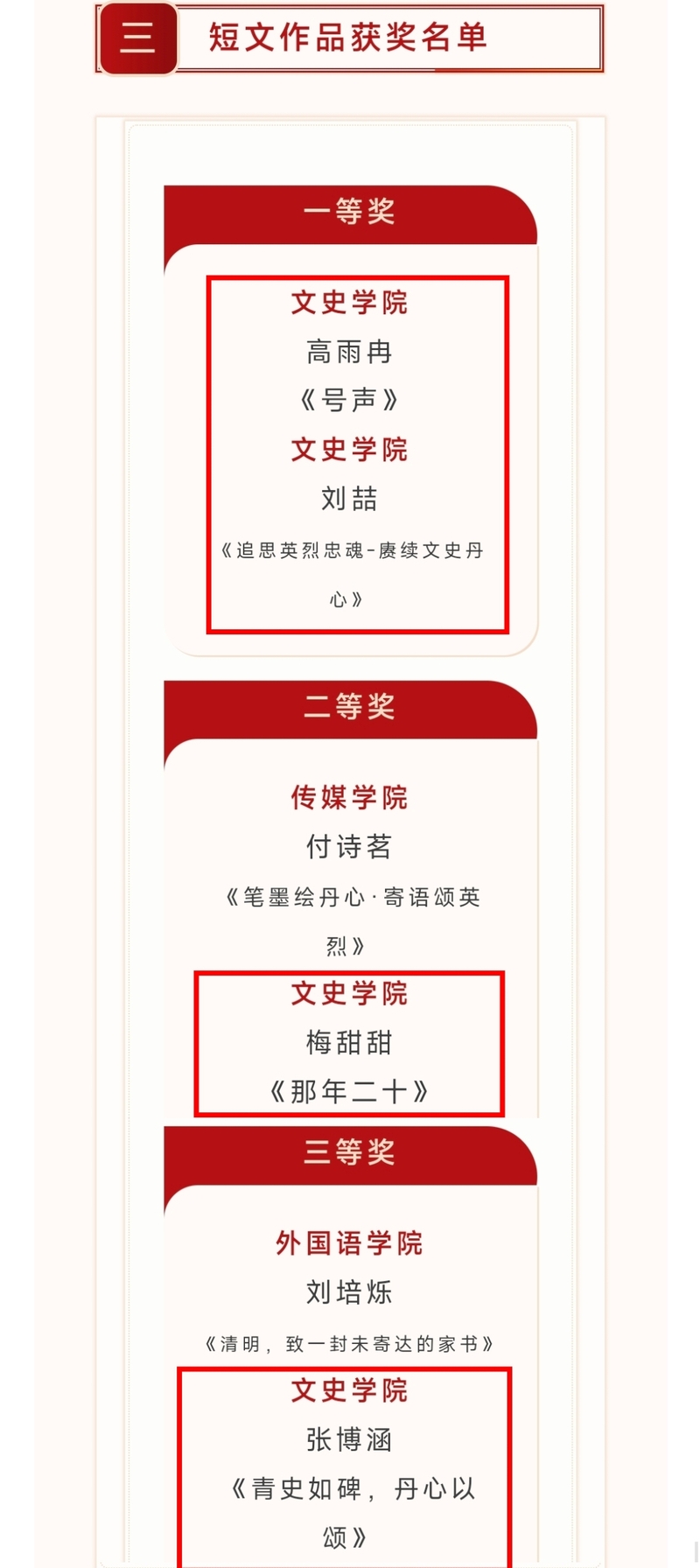 本次活动全校共征集作品185部,经严格评选,共有58部作品获奖,我院共有9部作品脱颖而出。其中,24级汉语言文学高雨冉《号声》、刘喆《追思英烈忠魂-赓续文史丹心》荣获短文一等奖;24级汉语言文学梅甜甜《那年二十》荣获短文二等奖;24级汉语言文学张博涵《青史如碑,丹心以颂》荣获短文三等奖;24级汉语言文学王雅琪《春风落清明·山河念英魂》斩获短视频二等奖;25级旅游管理(专升本)邢雨凭借《青山有幸,浩气长存》《清明祭英烈文》《清明》荣获书法两项一等奖、一项三等奖;25级旅游管理(专升本)赵超越、黄琳萱作品入选手工作品获奖名单。